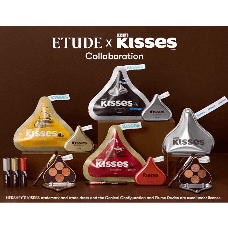 The Etude House x Hershey’s Kisses collection features limited edition conical shaped play color eye palettes, Kisses eyeshadow brush & Choco mousse tints.